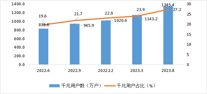 千兆宽带用户规模持续扩大。至8月底,我省固定互联网宽带接入用户总数达到4937.2万户,全国排名第2位;FTTH/O用户总数达到4614.8万户,全国排名第2位,占宽带用户总数的比重达到93.5%。1000M以上接入速率的宽带接入用户达 1345.4万户,全国排名第1位,占宽带用户总数的比重达27.2%,占比全国排名第2位。