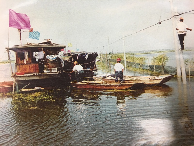 20世纪90年代,施工人员正在湖中布放架空光缆