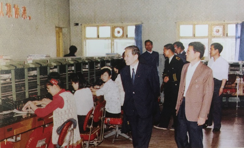 1988年,邮电部部长杨泰芳(前排左一)视察无锡人工长途台