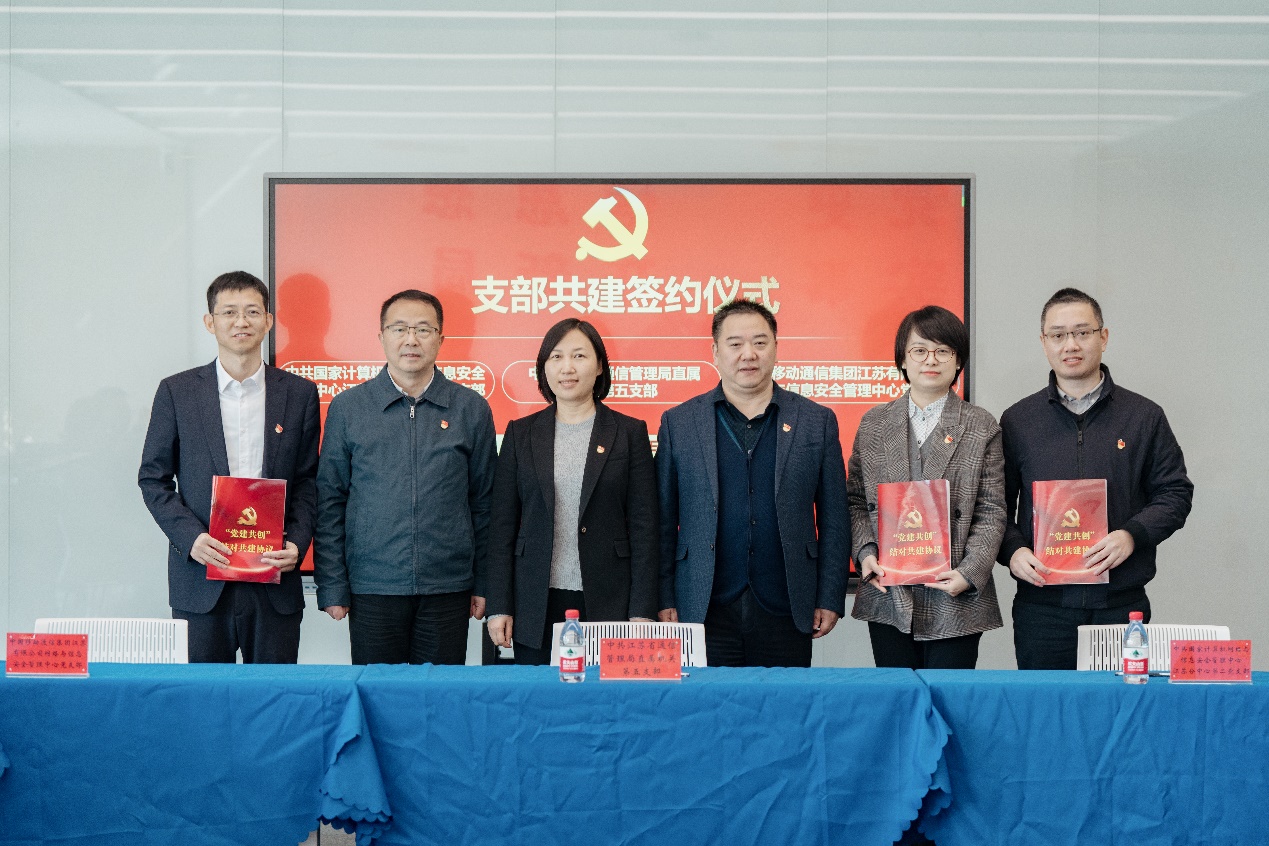 为深入学习贯彻习近平总书记关于网络安全和信息化工作的重要指示批示精神,进一步强化党建引领,更好发挥支部战斗堡垒作用,近日,江苏省通信管理局机关第五党支部同国家计算机网络与信息安全管理中心江苏分中心第二党支部、中国移动通信集团江苏有限公司网络与信息安全管理中心党支部联合开展“传承革命精神,构建网络空间命运共同体”主题党日活动,并举行党支部共建签约仪式。江苏省通信管理局党组成员、副局长张瑞英,国家计算机网络与信息安全管理中心江苏分中心党委书记、主任巫鹏程,中国移动通信集团江苏有限公司资深副总经理金泓以普通党员身份参加共建活动。